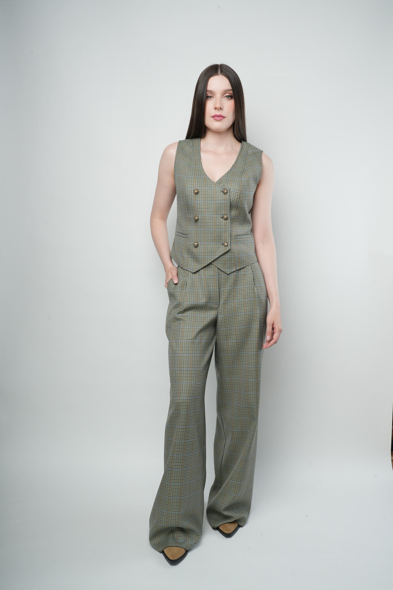 Confeccionado en paño escocés. Cruzado. Largo 50 CMS. La modelo usa talla XS.